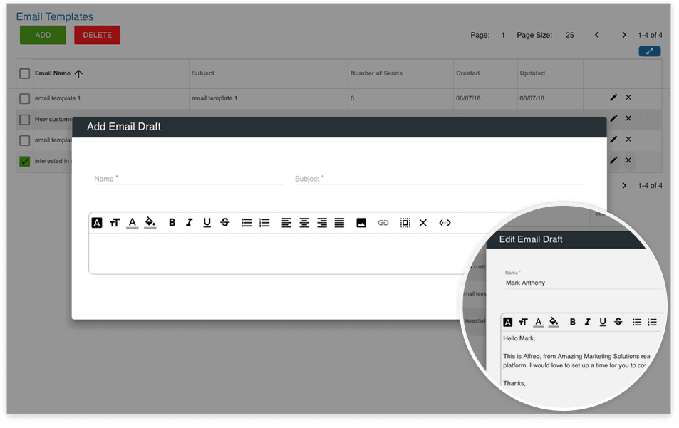 Create emails that can be saved and tracked to existing contacts as well as create automated email campaigns. See how your contacts engage with your emails with our engagement tracking.